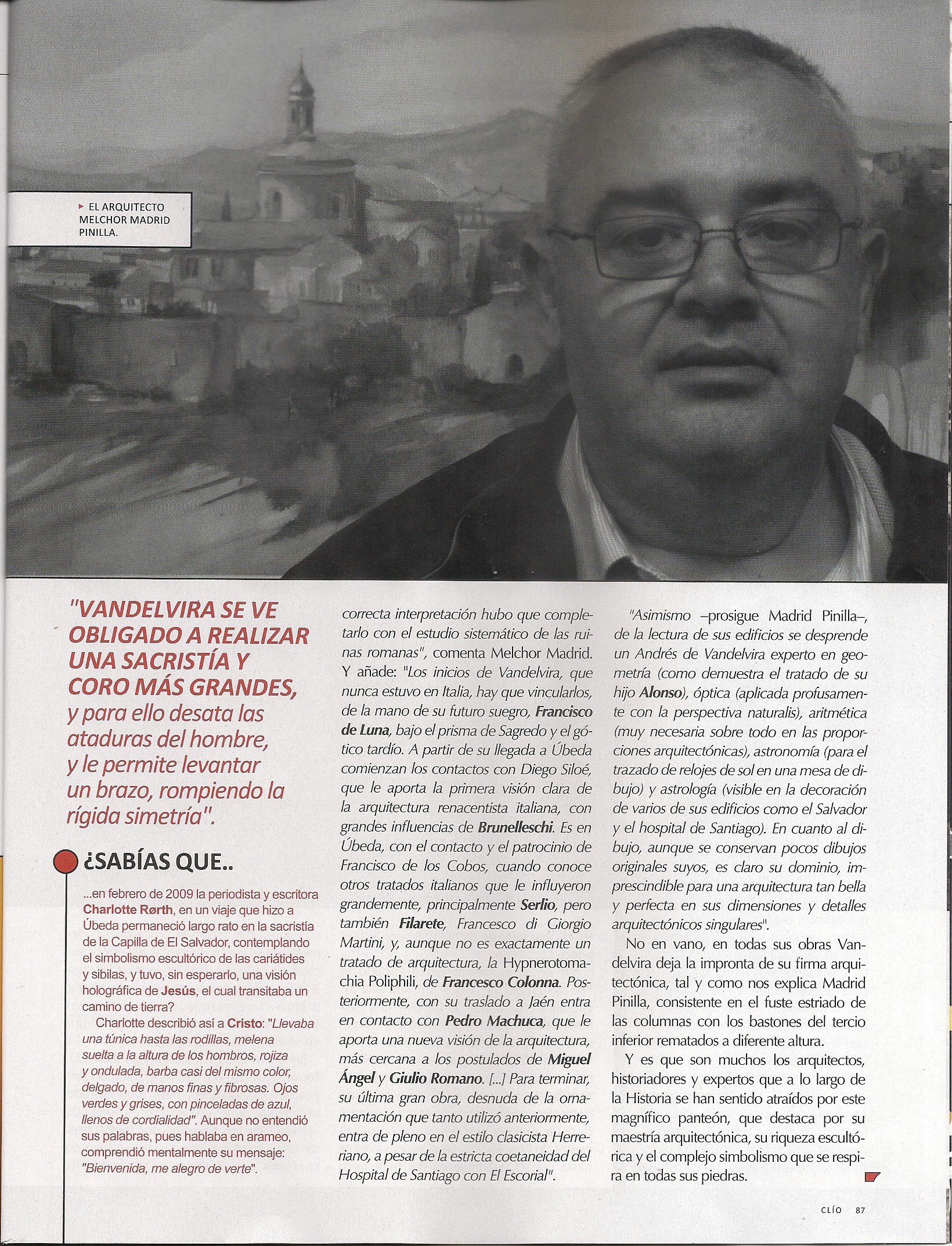 «Asímismo -prosigue Madrid Pinilla- de la lectura de sus edificios se desprende un Andrés de Vandelvira experto en geometría (como demuestra el tratado de su hijo Alonso), óptica (aplicada profusamente con la perspectiva naturalis), aritmética (muy necesaria sobre todo en las proporciones arquitectónicas), astronomía (para el trazado de relojes de sol en una mesa de dibujo) y astrología (visible en la decoración de varios de sus edificios como el Salvador y el hospital de Santiago). En cuanto al dibujo, aunque se conservan pocos dibujos originales suyos, es claro su dominio, imprescindible para una arquitectura tan bella y perfecta en sus dimensiones y detalles arquitectónicos singulares».
