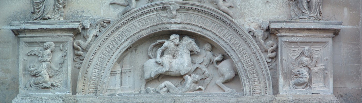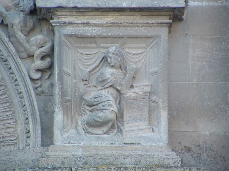 Sobre el arco triunfal de la portada norte de la capilla de El Salvador aparece representada en el frente de dos pedestales la escena de la Anunciación del ángel Gabriel a la Virgen María. El ángel, entre nubes, porta un báculo con una banda enrollada que recuerda al caduceo de Mercurio. Al otro lado, la Virgen María sentada sobre una mesa y leyendo un libro, se gira sorprendida ante la aparición del ángel.