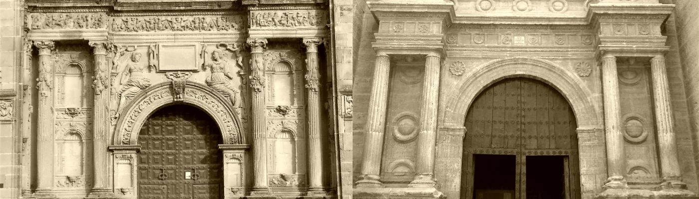 La principal diferencia está en el orden empleado, corintio en la ubetense, dórico en la de Villarrobledo. Sin embargo, un curioso detalle me llama la atención de esta portada. A primera vista, parece que el arquitecto, o los albañiles, olvidaron colocar el capitel dórico de las columnas del orden inferior. Parece como si el fuste de la columna se uniera con el entablamento sin la transición del capitel. Pero no es así. Si nos fijamos bien, existe, para cada par de columnas, un único capitel dórico corrido. Se trata de un alarde manierista que no había visto nunca, que podría perfectamente haber sido ideado por el genio de Andrés de Vandelvira.